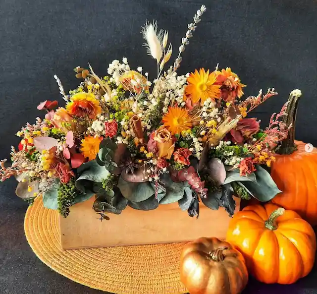 Centro de Mesa con Flores Naturales Secas y Preservadas en base de madera natural. (No incluye Calabazas & Mantel). Medidas: 28cm largo y 11 cm profundidad. NOTA: Pedidos con 2 Dias de Antelación.