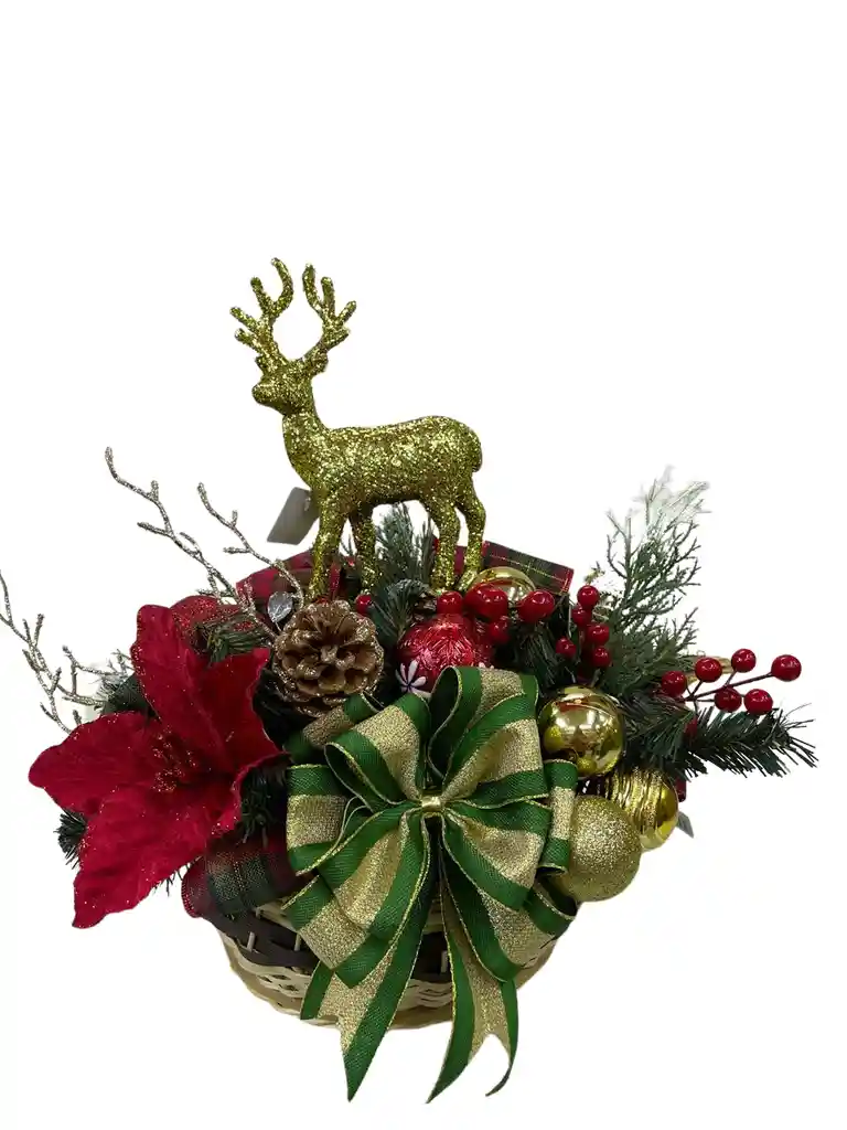 Centro de mesa navideño con reno decorativo, follaje festivo. Un detalle cálido y elegante para ambientar tu mesa en Navidad. Ideal para regalo o decoración del hogar.