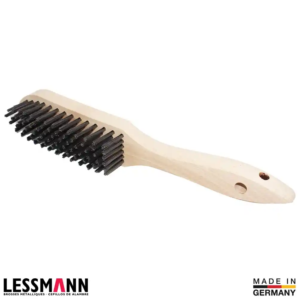 Herramienta manual con cerdas de alambre y mango de madera, diseñada para limpiar, remover óxido y preparar superficies, ideal para trabajos de mantenimiento en metal, hogar y obra.