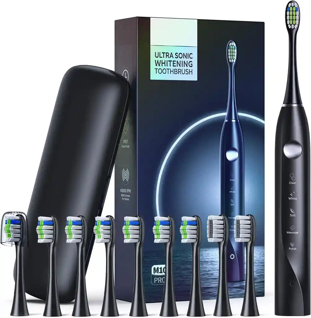 Nuestro cepillo de dientes eléctrico para adultos utiliza vibraciones sónicas avanzadas para brindar una experiencia de limpieza altamente efectiva, superando el poder de limpieza de los cepillos de dientes de cerdas huecas tradicionales. Experimente una limpieza más profunda y completa de sus dientes y encías. El cepillo de dientes electrónico recargable ANVS con batería integrada de 1200 mAH cuenta con carga rápida de 2,5 horas que dura hasta 90 días, superando con creces a otros cepillos de dientes del mercado. Y este cepillo de dientes sónico cuenta con un indicador de batería baja que parpadea en rojo cuando está bajo. El cable de carga USB incluido (adaptador no incluido). Limpio, Sensible, Blanco, Pulido, Masaje. Los 5 modos de cepillado están diseñados para satisfacer todas sus necesidades de cuidado bucal y ayudar a mantener una boca sana. NOTA: Apague los cepillos de dientes eléctricos presionando el botón de encendido durante 3 segundos. Nuestro cepillo de dientes eléctrico recargable para adultos Incluye 8 cabezales de cerdas suaves que brindan 2 años de uso. Cuando viaja, puede guardar un cepillo de dientes en una caja de viaje para facilitar su transporte. Control de temporizador inteligente integrado, intervalo de 30 segundos que le recuerda que debe pasar al siguiente cuadrante de la boca y totalmente en 2 minutos, lo cual es altamente recomendado por dentistas profesionales como forma de cepillado correcto.