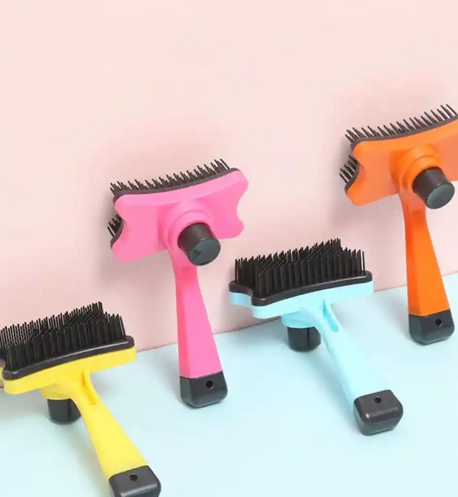 CEPILLO PARA PEINAR GATOS O PERROS CON MANGO DE AGARRE Y BOTON QUE AYUDA DE MANERA RETRACTIL A EXPULSAR EL PELO QUE SE CAE. COLORES AZUL BAYBY Y NARANJA