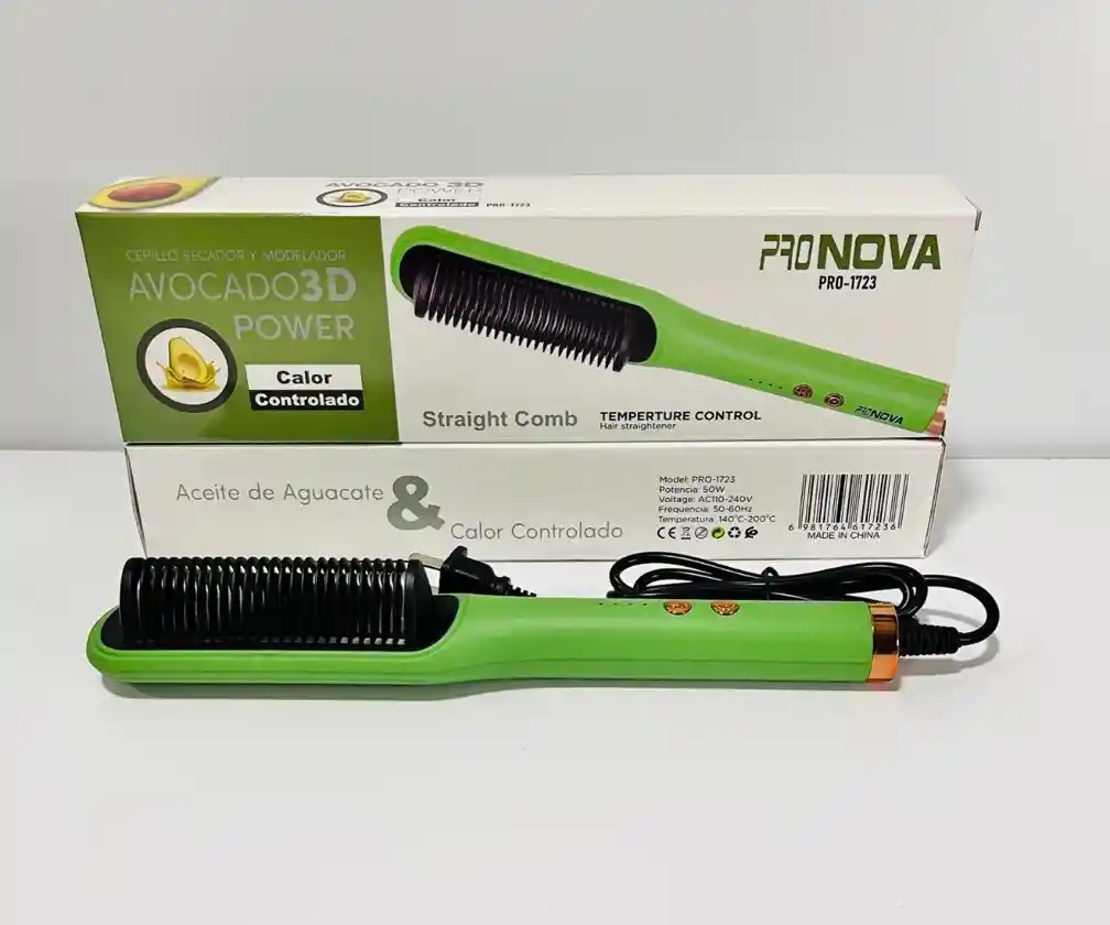 Función: Cepillo secador, alisador y modelador que también ayuda a dar volumen. Tecnología: Incorpora la tecnología "AVOCADO3D POWER", que utiliza aceite de aguacate y calor controlado para restaurar la humedad natural del cabello, aportar brillo y eliminar el frizz. Calentamiento: Se calienta rápidamente en aproximadamente 60 segundos gracias a la tecnología de calentamiento PTC, que distribuye el calor de manera uniforme. Uso: Puede ser utilizado tanto en cabello seco como húmedo. Especificaciones técnicas: Modelo: PRO-1723 Potencia: 50W Voltaje: AC 110-240V Frecuencia: 50-60Hz Temperatura: Rango de 140°C a 200°C.