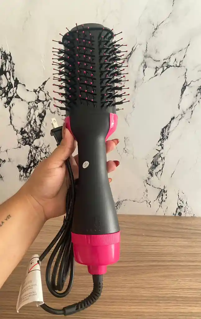 1. Diseño: cuerpo negro con detalles rosados en el mango y base del cepillo. 2. Cabezal: cepillo con cerdas negras y puntas rosadas que ayudan a desenredar el cabello mientras se seca. 3. Función: combina un secador y un cepillo para alisar y dar volumen al cabello con una sola herramienta. 4. Potencia: suele tener ajustes de velocidad y temperatura (indicados por los botones en el mango). 5. Accesorios: incluye un cable negro y una etiqueta de advertencia de uso (no sumergir en agua).
