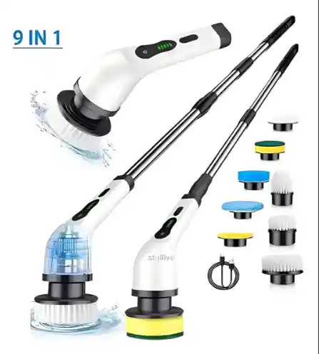 Un cepillo de limpieza 9 en 1 es un dispositivo multifuncional que incluye varios cabezales intercambiables (generalmente 9) para limpiar diferentes superficies como baños, cocinas, pisos, vidrios y muebles. 🔧 Características principales 9 accesorios o cabezales: cada uno diseñado para una función específica (esquinas, superficies planas, juntas, vidrio, etc.).