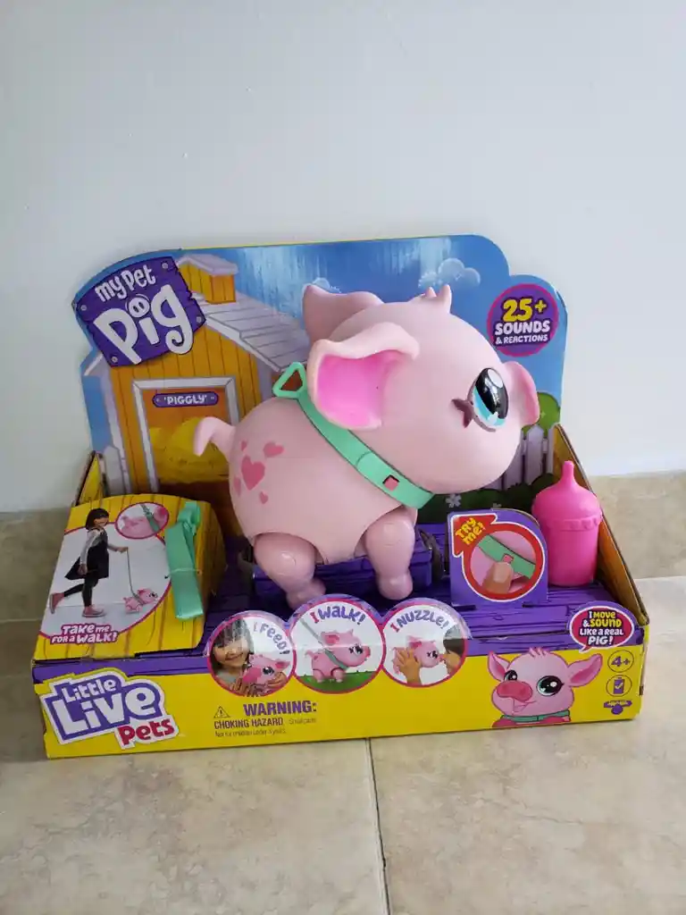 Mi Mascota Cerdito. Piggly se mueve y suena como un cerdo bebé real. Juguete interactivo suave y alegre que camina, baila y nozuela. Más de 20 sonidos y reacciones. Dale a Piggly su botella y mira cómo se mueve la nariz cuando bebe, eructa y ríe.