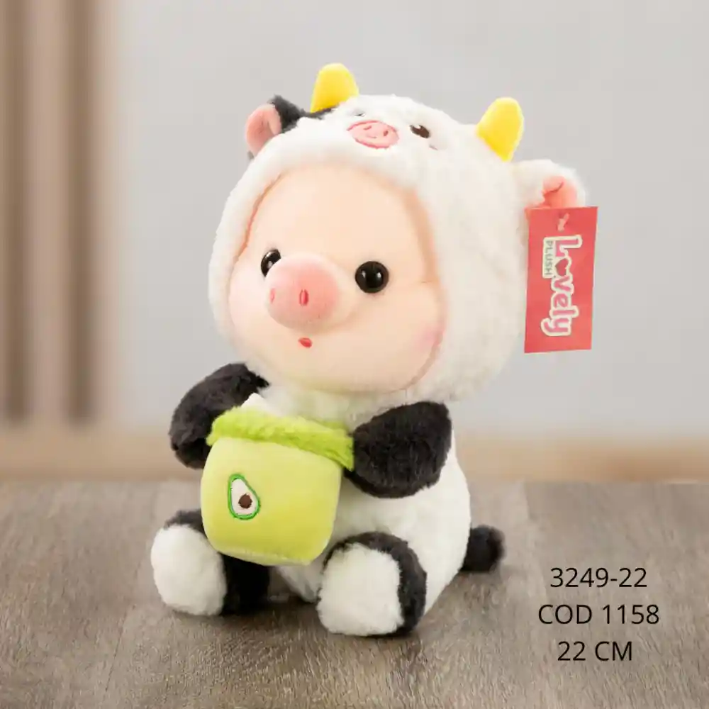 Hermoso peluche de Cerdo pijama de vaca afelpado de pelo corto. Excelente material y deliciosa fragancia. Tamaño de 22 centímetros.
