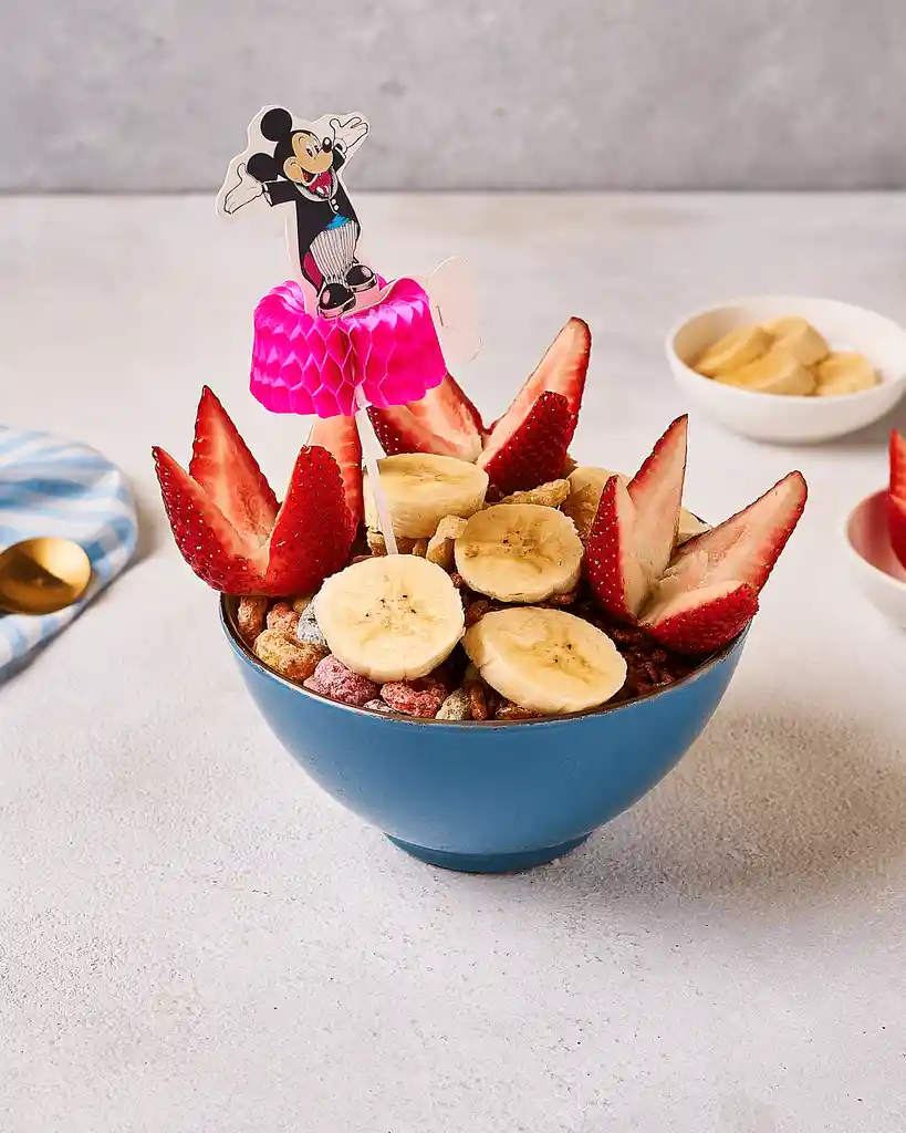 400 gramos de yogurt Alpina y 70 gramos de cereales entre zucaritas, floot loops y choco-crispis acompañado de fresa, y banano