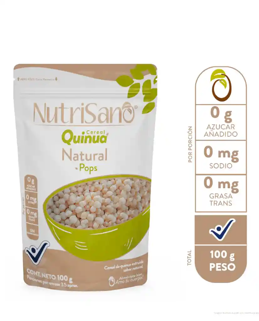 Cereal quinua pop natural Libre de gluten • Este cereal de quinua es una explosión de beneficios para tu salud diaria. Descubre cómo la quinua, un superalimento ancestral, puede elevar tu desayuno a nuevos niveles de vitalidad y bienestar.• Proteínas Completas: La quinua es única por ser una fuente de proteínas completas, proporcionando todos los aminoácidos esenciales necesarios para el desarrollo y la reparación de tejidos.• Rica en Fibra: Con una alta cantidad de fibra, nuestro cereal de quinua favorece la salud digestiva, ayudando a mantener un sistema digestivo equilibrado. • Nutrientes Esenciales: La quinua aporta vitaminas y minerales esenciales como hierro, magnesio y calcio, contribuyendo a la salud ósea y al equilibrio general del cuerpo.