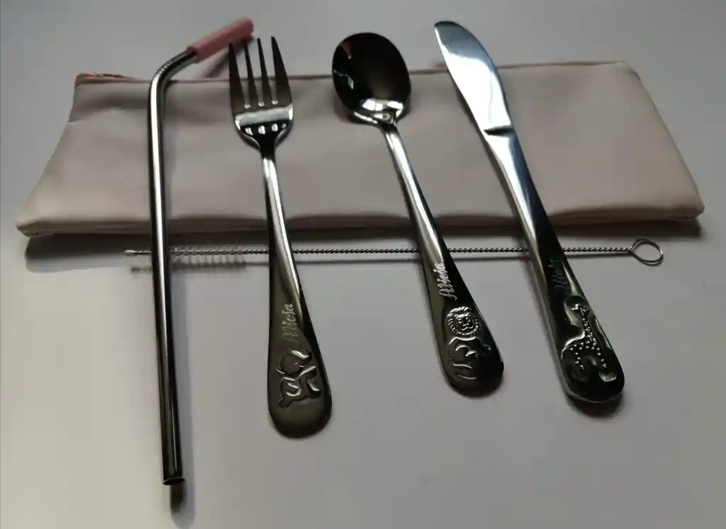 El set incluye: 1 Cuchara, 1 Tenedor, 1 Cuchillo, 1 Pitillo con boquilla en silicona, cepillo de limpieza para el pitillo y bolsita transportadora