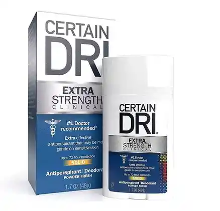 Desodorante clínico Dri Extra Strength es extra eficaz y puede ser más suave en la piel sensible. Se ha demostrado que el ingrediente activo de aluminio Sesquiclorohidrato de aluminio en Ciertos Dri Extra Strength Clinical proporciona hasta 72 horas de protección para personas con hiperhidrosis