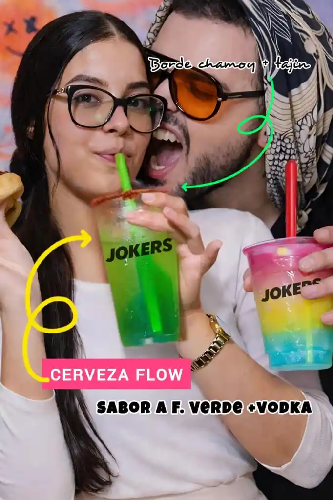 Vaso de 22 onzas(650ML) con borde en chamoy + tajin, acompañado de hielo, limon, cerveza + vodka con sabor a fusion verde con toque de la casa especial que lo hace una bebida unica y diferente por su sabor y frescura.