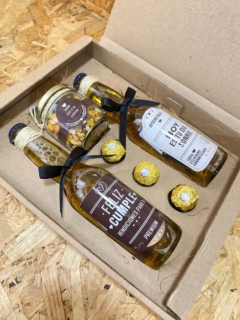 CAJA KRAFT CON DIVISIONES 2 CERVEZAS CORONA PERSONALIZADAS , FRASCO DE FRUTOS SECOS , FERRERO X3 , TAPA CON MENSAJE EN VINILO Y MOÑO DE TELA, TARJETA Y 2 GLOBOS EN HELIO