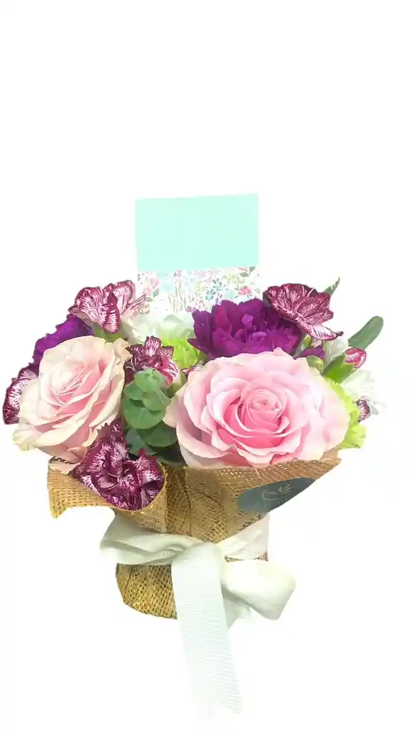 cesta de yute con flores surtidas, contiene ( 3 rosas rosadas, 3 claveles verdes, 2 claveles fucsia o morados, 3 mini claveles bicolor vino y blanco, 2 eucaliptos baby)