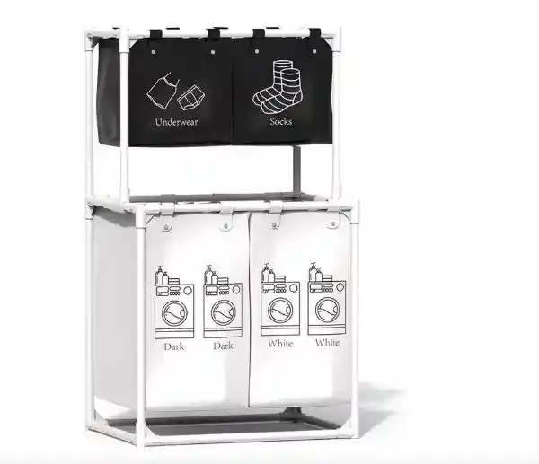 Cesta Clasificadora De Ropa Sucia De 2 Niveles, Cesta De Almacenamiento Para Ropa Sucia, Organizador De Ropa Sucia, Clasificador De Ropa Sucia Para Lavandería Especificación: Color: Blanco + Negro Tejido: No Tejido Marco Material: Tubo De Fibra De Vidrio Talla:22.05 "L x 15.35" W x 37.4 "H / 56cm(L) X 39cm(W) X 95cm(H) Estilo: 4 Cestas Forma: Rectángulos Número de piezas: 1 ----------------------------------------------------------------------------- [Diseño de gran capacidad]: Cesto con 4 compartimentos separados hacia arriba y hacia abajo, ofreciendo un amplio espacio de almacenamiento y maximizando la organización para diferentes tipos de lavandería o artículos del hogar. Cuenta con parte inferior elevada, manteniendo la cesta lejos de superficies húmedas o sucias del suelo, manteniendo la limpieza y preservando tus artículos. Diseñado con botones a presión, lo que hace que instalar y quitar la cesta sea muy fácil, asegurando la estabilidad durante el uso y facilitando el montaje sin complicaciones. [Versátil]: Esta cesta clasificadora de ropa te ayuda a organizar la ropa sin esfuerzo, lo que te permite clasificar la ropa interior, los calcetines, los oscuros y el blanco convenientemente, agilizando tu rutina de lavandería al clasificar previamente la ropa a medida que se acumula, haciendo que el día de lavandería sea muy fácil. No sólo para la colada. Utilízalo para guardar juguetes, equipos deportivos u otros artículos del hogar para mantener tu espacio ordenado y organizado. Además, su elegante diseño complementa cualquier decoración, mejorando la estética de tu área de lavandería. [Solución de ahorro de espacio e idea de regalo]: El diseño compacto y vertical ocupa un espacio mínimo, ideal para espacios más pequeños, como apartamentos, dormitorios, dormitorios, baños, lavaderos o áreas de estar limitadas. Es un maravilloso regalo para familiares, amigos y cualquier persona que siempre busque soluciones de almacenamiento eficientes. [Material y tamaño]: El marco de plástico reforzado y resistente garantiza una excelente capacidad de carga, mientras que la construcción de tela de algodón y lino mejora la transpirabilidad de tu ropa. Con un tamaño de 56cm de largo, 39cm de ancho y 95cm de alto. [El paquete incluye]: 1 cesta clasificadora de ropa (otros artículos decorativos que se muestran en las imágenes no están incluidos)