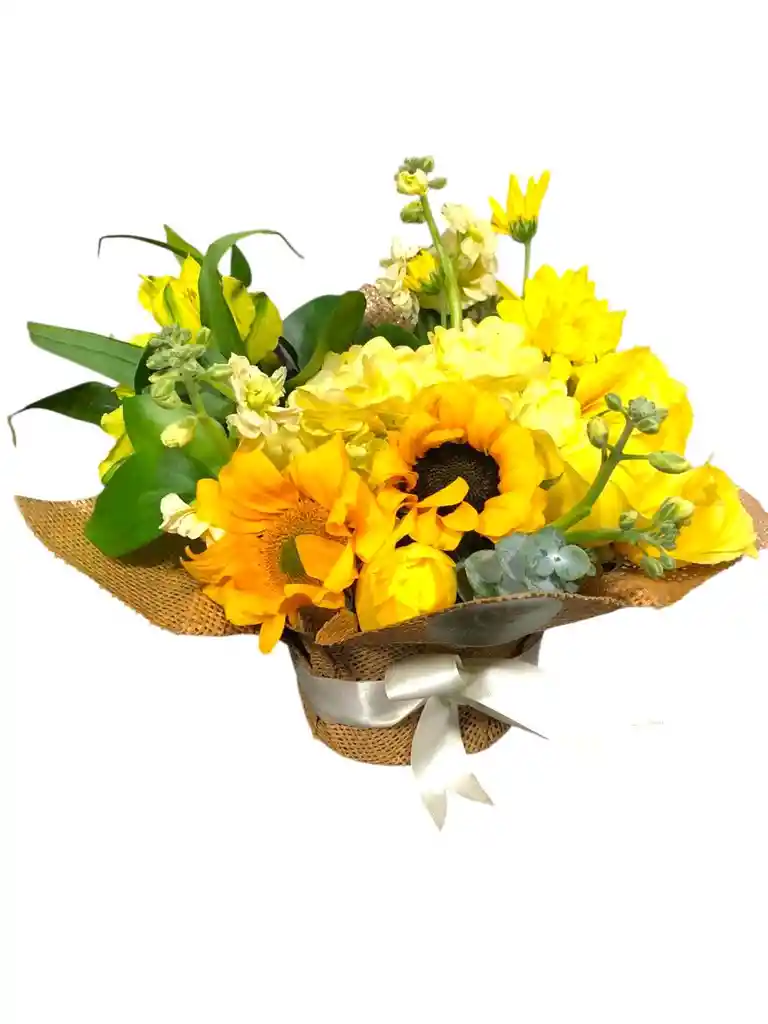 Cesta en tute con 12 flores amarillas variadas ( 1 hortencia, 3 rosas, 1 pompon, 3 aleís,1 rusco, 2 mini girasoles, 1 alstromelia)