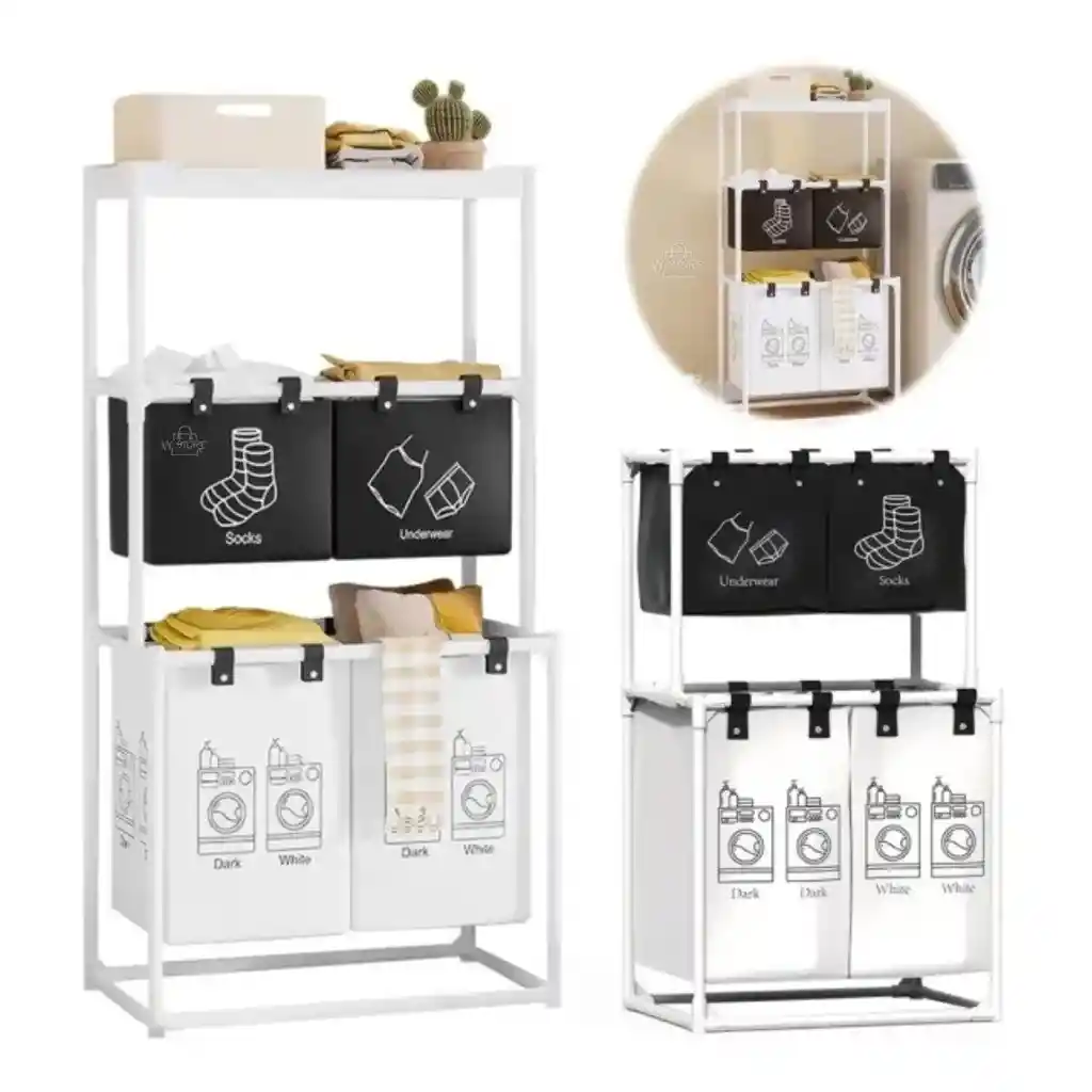 Medidas: 123 alto. 44 Profundidad. 57 ancho Tipo de organizador: Organizador de espacio para lavandería. Material: La estructura es de metal. Diseño: Cuenta con un diseño de 2 niveles con separadores individuales para organizar diferentes tipos de prendas. Capacidad: Posee una gran capacidad de almacenamiento para ropa sucia, con un diseño abierto y amplio en cada cesto. Versatilidad: Es ideal para usar en diversos espacios del hogar como el baño, la lavandería o el dormitorio, adaptándose a cualquier decoración. Color: El modelo mostrado tiene la estructura y algunos cestos en color blanco. Movilidad: Este modelo específico no cuenta con ruedas