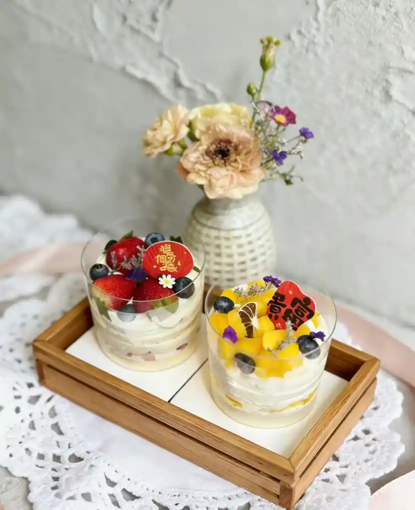 Es un pastel dulce hecho de harina, huevos, leche y azúcar. Hay crema, galletas, frutas y decoraciones florales en la superficie (las personas con las alergias alimentarias anteriores no deberían comprarlas. Las flores son solo decorativas y no deben comerse).La fruta de la imagen se ajustará de acuerdo con la fruta fresca del día.