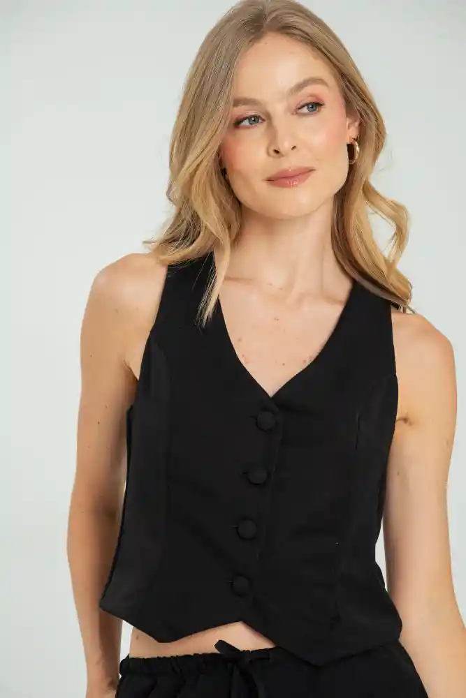 Chaleco en tejido plano fondo entero, escote en V con botonado en la parte delantera con botones forrados 32L, corte en centro espalda, silueta semi ajustada.