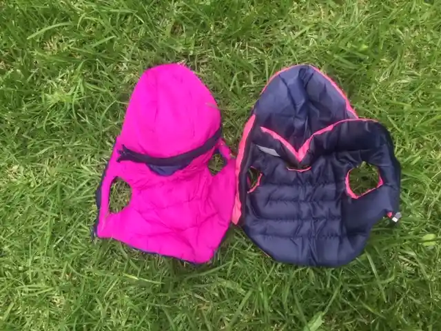 chaleco impermeable con capota de color morado XS de medidas 17 cms de largo por 28 cmms de pecho