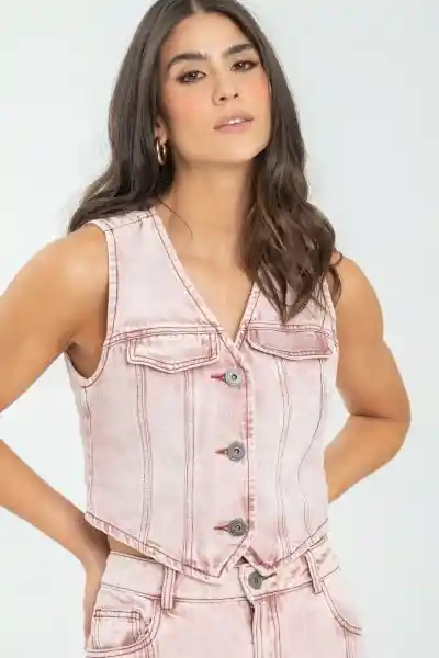 En Denim Color 100% Algodón Tono Medio Con Manualidad Cuello en V Con Botones en Frente Manga Sisa Detalle de Jareta en Espalda.