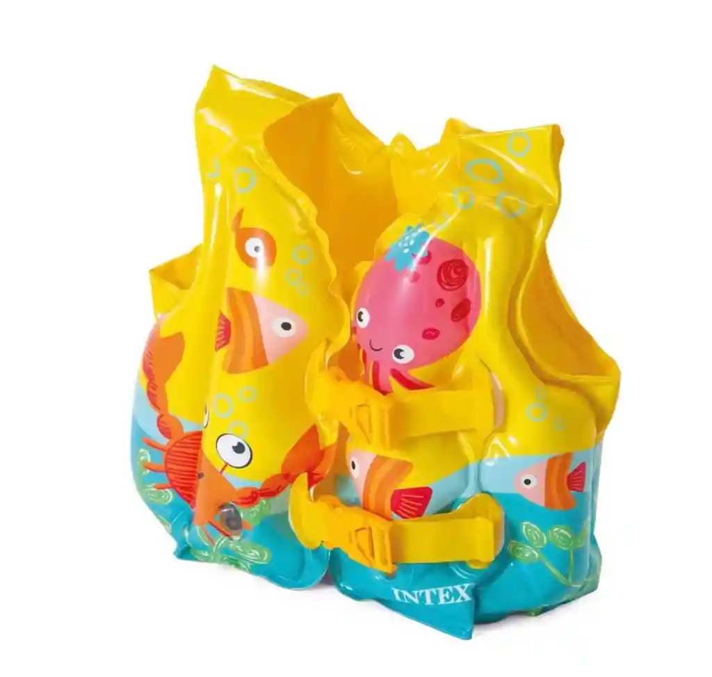 Forma del inflable: Manual. Construcción robusta de 10 ga. 0.25mm Vinilo para mayor seguridad. Tres compartimentos de aire para mayor flotabilidad. Cierre de seguridad doble con hebilla de sujeción a tres puntos. Diseño con motivos de animales marinos adecuado para niños. Recomendado para edades de 2 a 6 años con peso entre 18-30Kg.