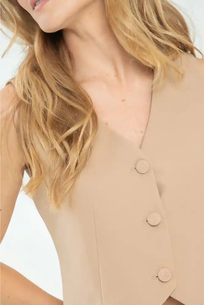 Chaleco en tejido plano fondo entero, botonado en centro frente con botones forrados 32L, pinzas en la parte delantera y trasera, piezas en tela contraste alrededor del ruedo, silueta semi ajustada.