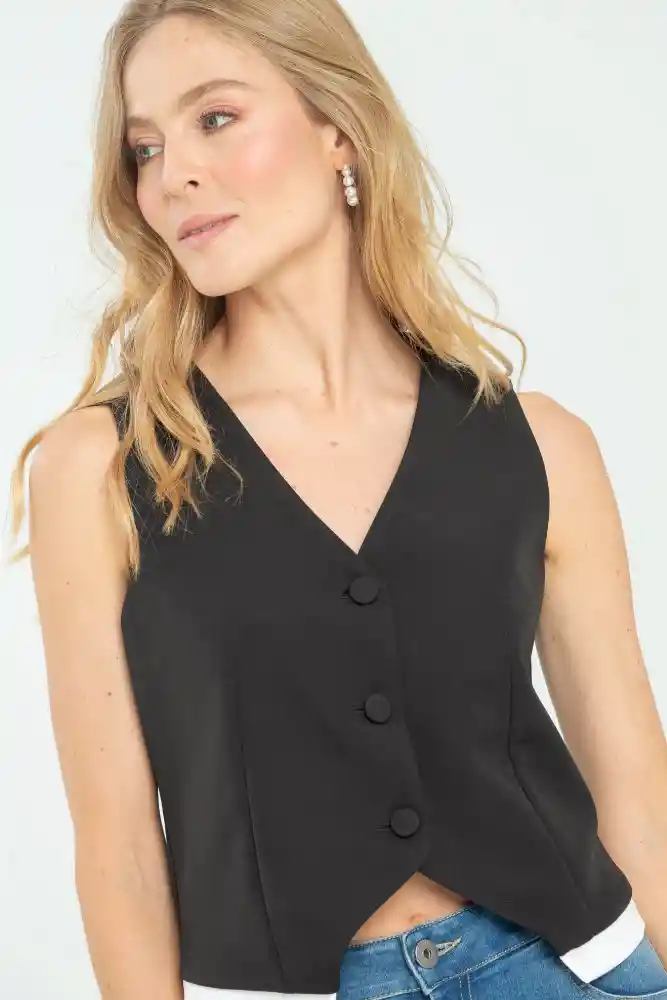 Chaleco en tejido plano fondo entero, botonado en centro frente con botones forrados 32L, pinzas en la parte delantera y trasera, piezas en tela contraste alrededor del ruedo, silueta semi ajustada.