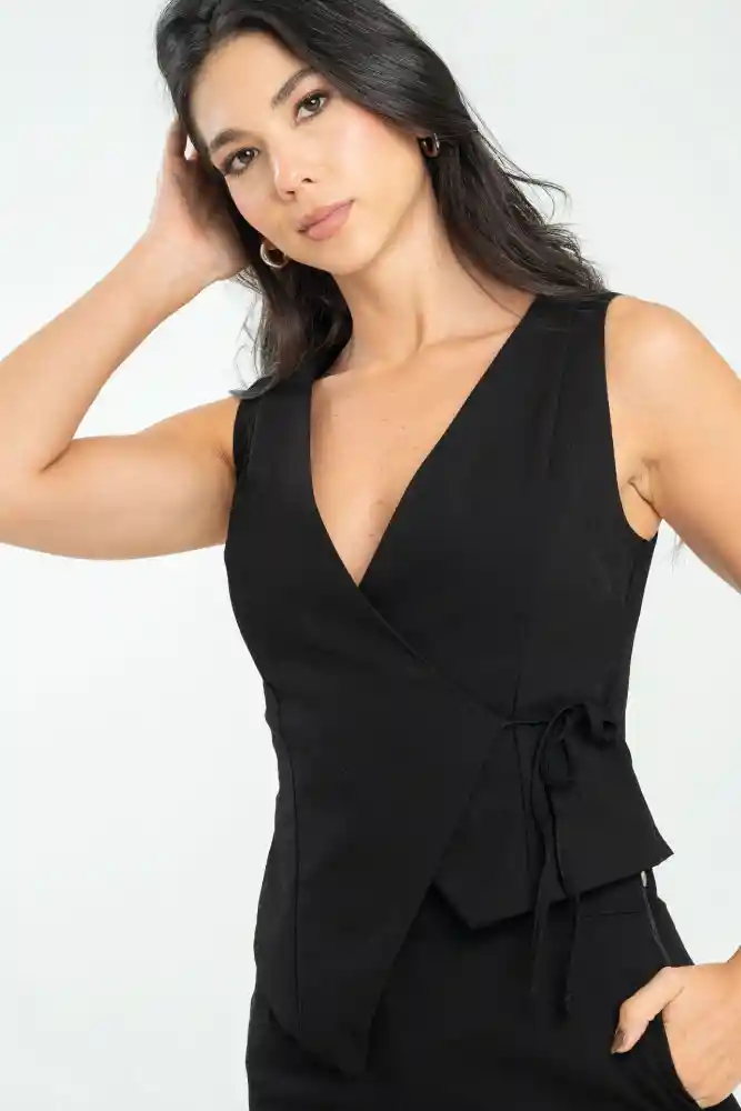 Chaleco en tejido plano fondo entero, escote en V en la parte delantera cruza y anuda con tiras en el lado izquierdo, puntas asimétricas en el delantero, ruedo de 2cms en la parte trasera. silueta semi ajustada.