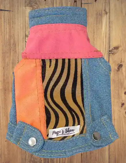 Chaleco en jean, acompañado de unas telas en color. ideal para consentir a tu mascota y que luzca maravillosa. Puede ser utilizado en gatos pequeños y/o chihuahuas.