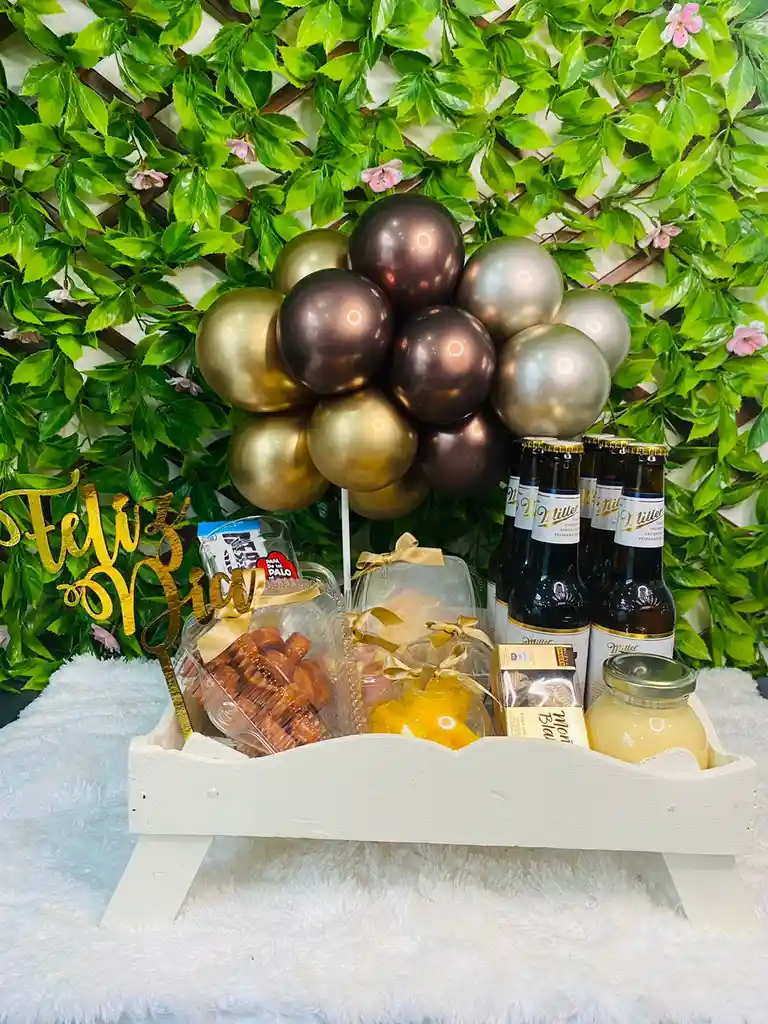 BASE MADERA PINTADA DECORADA CON GLOBOS REFLEX Y MDF DE FELIZ DIA DESAYUNO: 2 CHORIZOS BBQ, 2 MINI AREPAS RELLENAS DE POLLO Y QUESO MOZARELLA, JUGO DE COROZO, PORCION DE FRUTA Y POSTRE BUCHANAN'S DELUXE 375 ML MUGS PEQUEÑO O LLAVERO ROLLOS DE JAMON Y QUESO MANI CHOCOLATE HERSHEY SET DE CHOCOLATES MONT BLANC X 3 YOGURT MOÑO