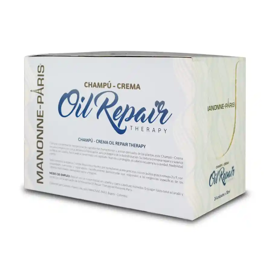 CHAMPÚ-CREMA OIL REPAIR THERAPY El Champú-Crema Oil Repair Therapy de textura cremosa, repara y suaviza las fibras del cabello facilitando el desenredo y el cepillado. Es una composición única con una concentración excepcional de ingredientes humectantes y aceites derivados de las plantas que penetran en la fibra capilar para protegerla de la deshidratación. El Aceite de Crambe Abyssinica Hochst, es rico en ácidos grasos omega 3 y 9, tiene propiedades nutrientes y reparadoras para los cabellos maltratados, demasiado secos y frágiles. MODO DE EMPLEO: Aplicar con un suave masaje en cabello y cuero cabelludo húmedos. Enjuagar hasta total aclarado y continuar con la aplicación de la Mascarilla Oil Repair Therapy de Manonne-Paris. Presentación: Caja sachet x 30ml x 24 unds