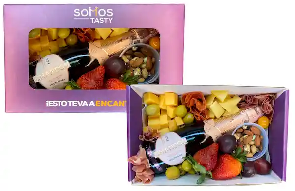 Esta Caja Premium De Carnes Frías Y Quesos Incluye Los Siguientes Ingredientes: Chandon Vino Espumoso Rose Botella 187 Ml + Jamón Serrano 1 Und + Chorizo Español 1 Und + Queso Holandés 1 Und + Queso Emmental 1 Und + Aceitunas Rellenas 1 Und + Frutos Secos 1 Und + Mix De Frutas De Temporada.. .. .