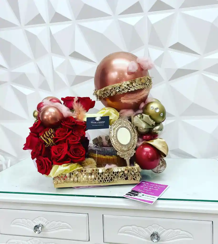 Base de madera con florws,globos, torta y decorativos elegantes según imagen ( tarjeta incluida)