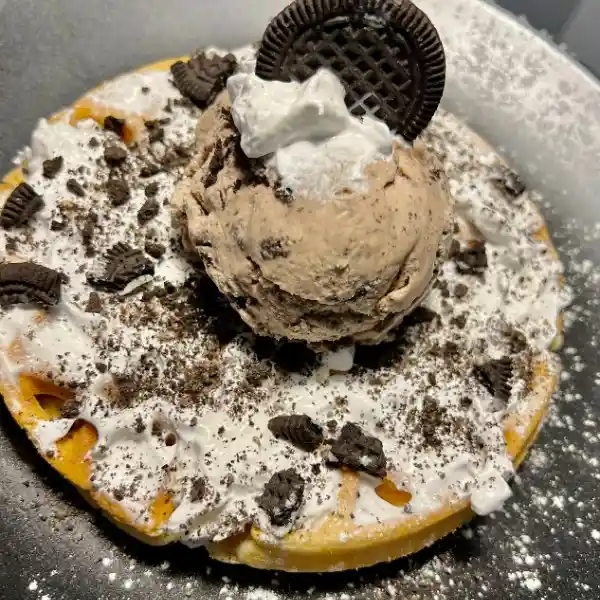 Waffle con chantilly, galleta Oreo triturada y helado