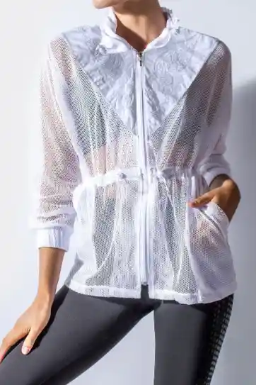 Chaqueta larga de malla con cuello recogido, cierre frontal, bolsillos laterales, cintura con elástico interno ajustable detalle bordado de estrellas y lentejuelas. TALLA ÚNICA