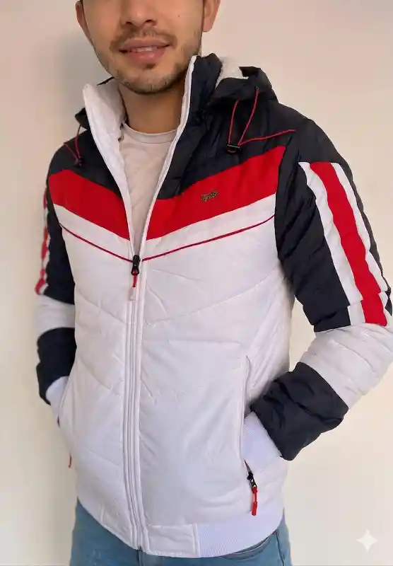 Esta chaqueta acolchada para hombre destaca por su diseño moderno y funcional. Fabricada en poliéster repelente al agua, cuenta con un forro interior de piel sintética que garantiza calidez y comodidad. Su estilo tricolor combina azul marino, blanco y rojo, con prácticos bolsillos laterales y una capucha ajustable. Ideal para el invierno y actividades al aire libre. ¡Compra ahora!