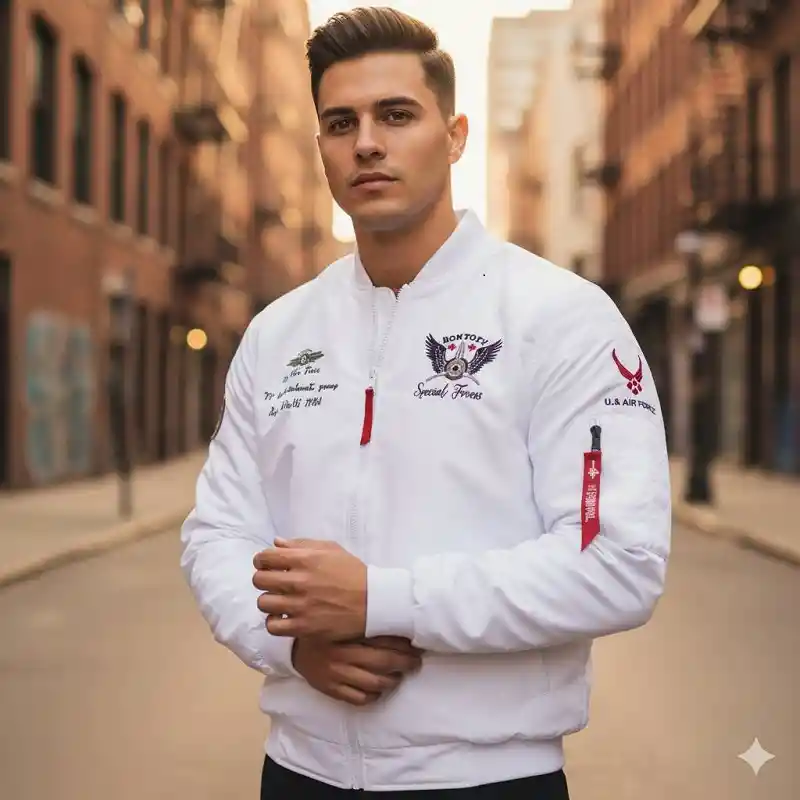Chaqueta Bomber Táctica "Bontopy Special Forces" - Navy Blue. Lleva tu estilo urbano al siguiente nivel con esta chaqueta inspirada en las fuerzas especiales. Fabricada en azul oscuro con detalles bordados "Bontopy" y parches "U.S. AIR FORCE", esta bomber combina durabilidad con un diseño audaz. Cuenta con bolsillos funcionales y el icónico tirador de cremallera rojo. ¡Cómprala Ahora!