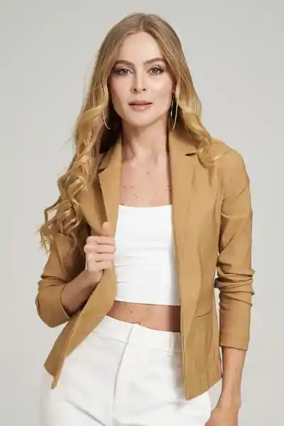 En Bengalina Fondo Entero Cuello y Manga Larga Ribetes Funcionales Detalle de Abertura en Ruedo Espalda.