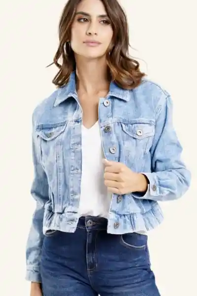 En Denim Lavado Medio Claro Con Cuello Clásico y Cierre Con Botones en el Frente Silueta Cropped Oversize Sisa Rodada Bolsillos Con Tapa y Botón Sobre el Pecho Fajón Enresortado.