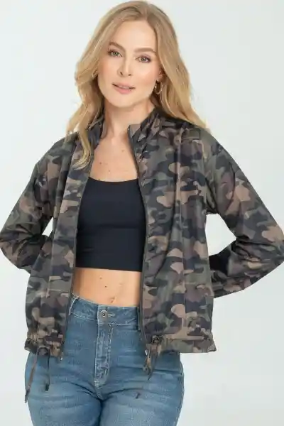 Bomber en Tejido Plano Estampado Militar Cuello Nerú Con Cierre Separable en Frente Manga Con Elástico y Mini Bolero en Puño Elástico en Cintura Con Jareta.