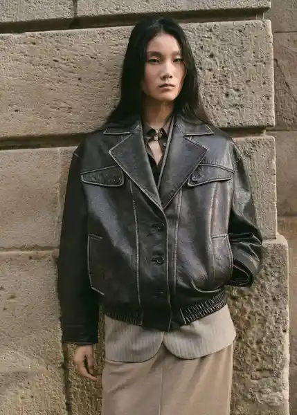 100% Piel de Bufalo Cierre Delantero Con Botones Colección Selection Cuello Pico Con Solapa Diseño Oversize Dos Bolsillos de Ribete Laterales Dos Bolsillos de Solapa en el Pecho Estilo Bomber Exclusivo Online Forro Interior Manga Larga Panel Fruncido en la Cintura Piel de Napa Solapas Con Muesca - 27084772_30.