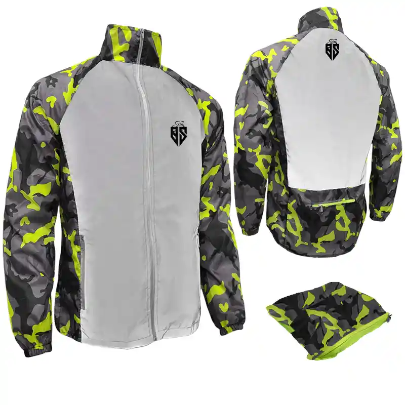 • Chaqueta corta vientos portable reflectiva. • Tela 100% reflectiva en pecho y espalda. • Repele el agua ante lluvias cortas (No lluvias prolongadas). • Sirve para para cubrirse del frío y la lluvia mientras montas en tu bicicleta, Moto o deportes varios. • Por su material la puedes llevar en cualquier parte, pues doblada cabe en la palma de una mano. • Ultraliviana-antifluidos. • Cintura Resortada para mayor ajuste. • 3 bolsillos exteriores • Bolsillo trasero (especial para guardarla portable) • Diseño sin capota con cuello alto (evita filtraciones de aire). • Semi-impermeable (tela 100 % impermeable) (costuras y cremalleras no impermeables) • Para determinar la talla correcta verificar la tabla de tallas descrita a continuación y tomar las medidas correspondientes. TABLA DE TALLAS HOMBRE: • Talla M : Chaqueta (Largo total 84 cm X Ancho de pecho 55 cm, Largo manga (desde el cuello) 79cm) • Talla L : Chaqueta (Largo total 86 cm X Ancho de pecho 58 cm, Largo manga (desde el cuello) 80 cm) • Talla XL : Chaqueta (Largo total 88 cm X Ancho de pecho 61 cm, Largo manga (desde el cuello) 83 cm) • Talla XXL : Chaqueta (Largo total 90 cm X Ancho de pecho 63 cm, Largo manga (desde el cuello) 84 cm)