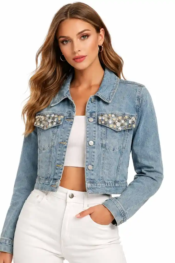 Chaqueta de denim con diseño moderno y femenino, destacada por sus bolsillos superiores decorados con apliques tipo joya, perlas y figuras metálicas que aportan un estilo único y llamativo. Su corte corto estiliza la silueta y la hace perfecta para looks casuales o de moda. Ideal para combinar con jeans, faldas o pantalones de cintura alta