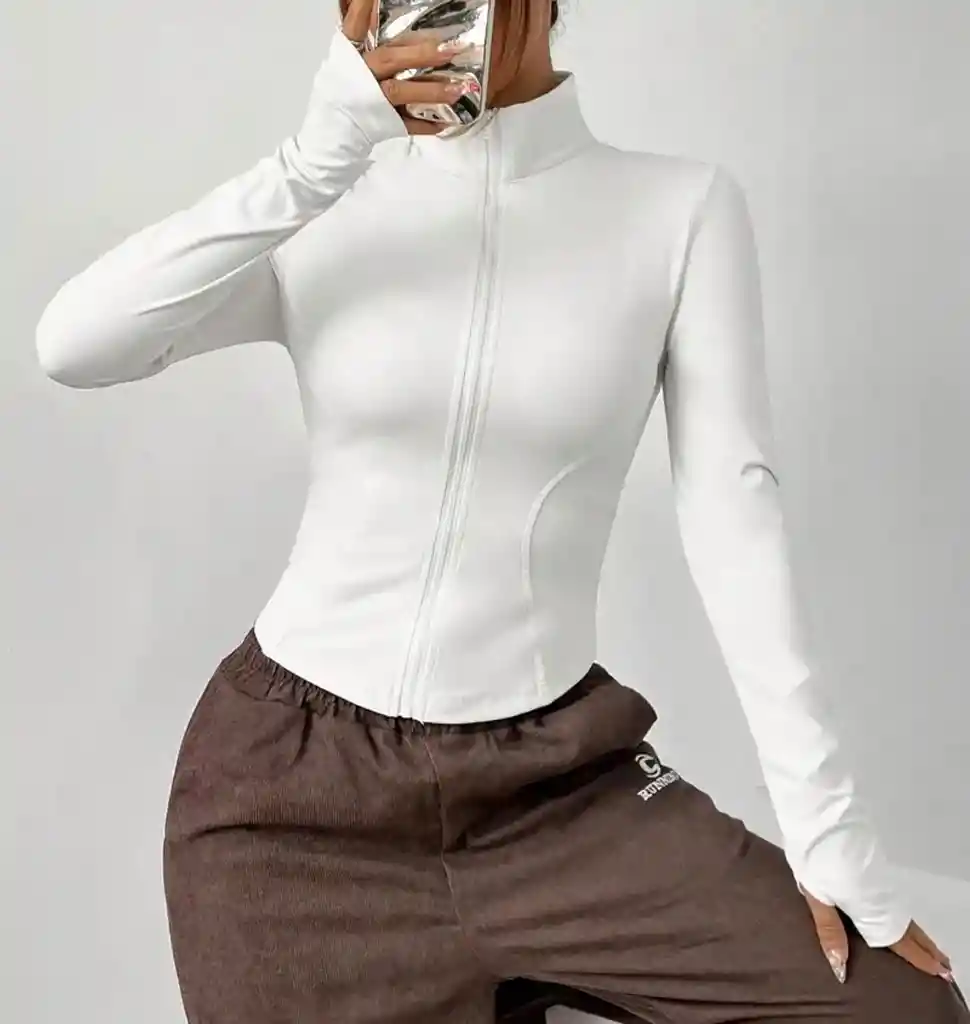 Chaqueta licrada deportiva dama, color blanco, talla S y material licrado liso.