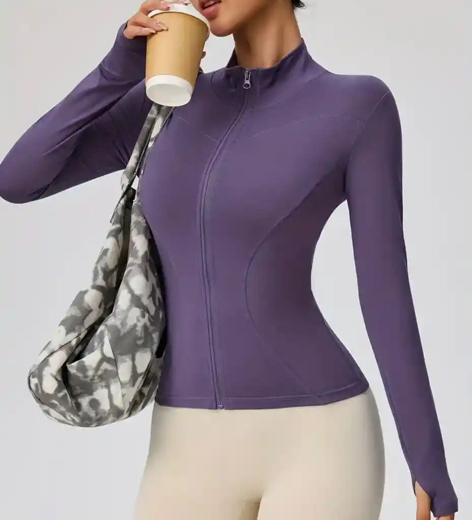 Chaqueta deportiva dama, material licrado liso, color morado oscuro, talla L