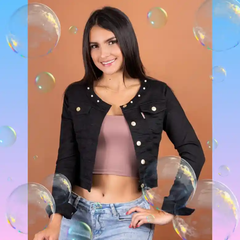 Chaqueta en jean negra cuello redondo con detalles de perlitas negra semitorero disponible S-M-L-XL