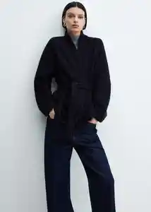 Cinta en la Cintura Con Cierre de Lazo Cuello Pico Diseño Cruzado Diseño Recto Dos Bolsillos de Ribete en la Parte Delantera Manga Larga Tejido Mezcla de Lana Trabillas - 67050682_56.
