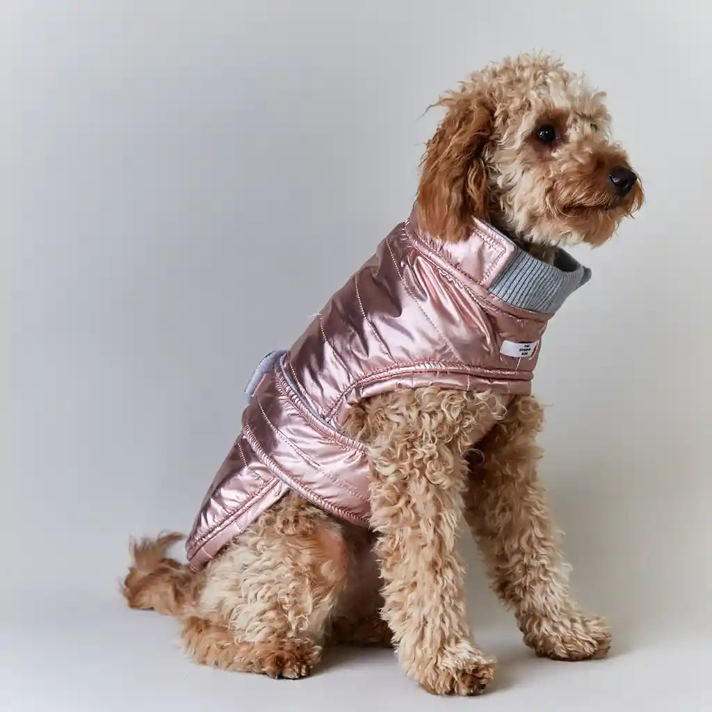 Chaqueta impermeable rosada con cuello tortuga e interior en fleece gris claro. Medidas: Cuello 50 cm Largo espalda 45 cm Pecho 65-80 cm