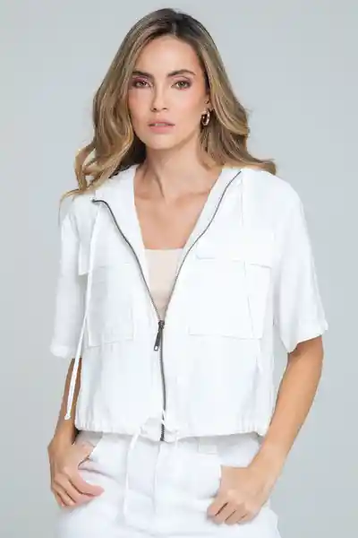 Chaqueta en twill fondo entero con capucha, bolsillos con tapa en delantero, manga corta, silueta amplia y cremallera en frente.