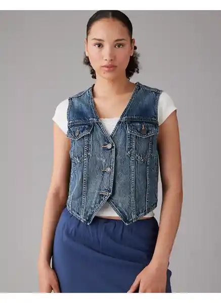 Denim de Algodón en Lavado Oscuro Cuello Clásico Botón en el Frente Sin Mangas Doble Bolsillo de Parche Con Cerrado de Botón Doble Bolsillo de Parche